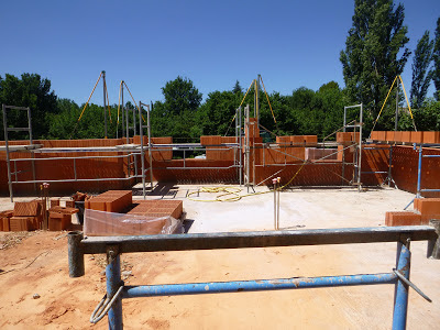 It has been a strange 'summer' weather-wise. In spite of a protracted chilly spring we finally had some really hot days in June - reaching a stifling 37C  in sharp contrast to 8C at the beginning of the month. On the building site - obviously the cooler days were easier on Nicco and Boris, putting up the brick wall under the searing heat isn't a job I'd like to do. By the 4th of July the walls were up to the tops of the windows and they were ready for pour the reinforcing.  They are off for a few days and will be back to pour the reinforced belt around the house at the top of the windows next week.